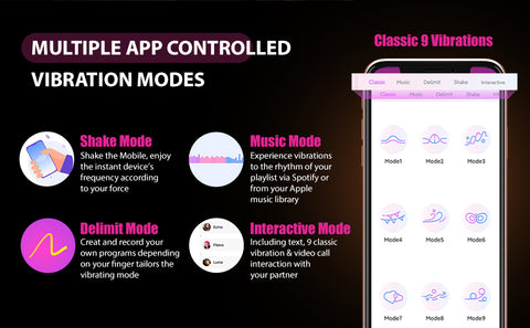 The compatibility with the webcam lets you & your partner access the functions of text, 9 classic vibrations & video calls in interactive mode. Watch your partner’s masturbation & sync you to reach concurrent orgasms. Classic mode offers 9 instant vibrations. Music mode syncs the vibration with your favorite music. Delimit mode creates distinctive vibration & shake mode custom-makes different shaking frequencies.