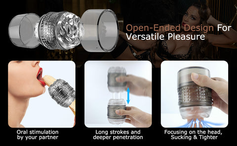 When you remove one lid and do the solo play with leaving the other lid on the stroker, there will be a vacuum created when you thrust, and you will have an ineffable and tighter feeling. When you do the foreplay with your partner, visual pleasure can be got with this male stroker. Let your partner play for you, focus completely on the head. And the head of the penis can protrude out from the other end allowing for oral stimulation by your partner.