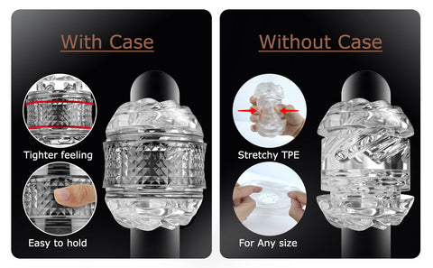 In order to provide a better user experience, we adopt the new design philosophy. The masturbator case is coated specifically with non-slip diamond grain for an easy handhold. You can use it with the stroker’s case, and the relatively compact stroker’s case will deliver you a brilliant bound feeling. Or you can also remove the stroker’s case, and the stretchy TPE enables you to squeeze your shaft as tight as your wish for custom sensation. This operation can accommodate most men’s penis with ease.